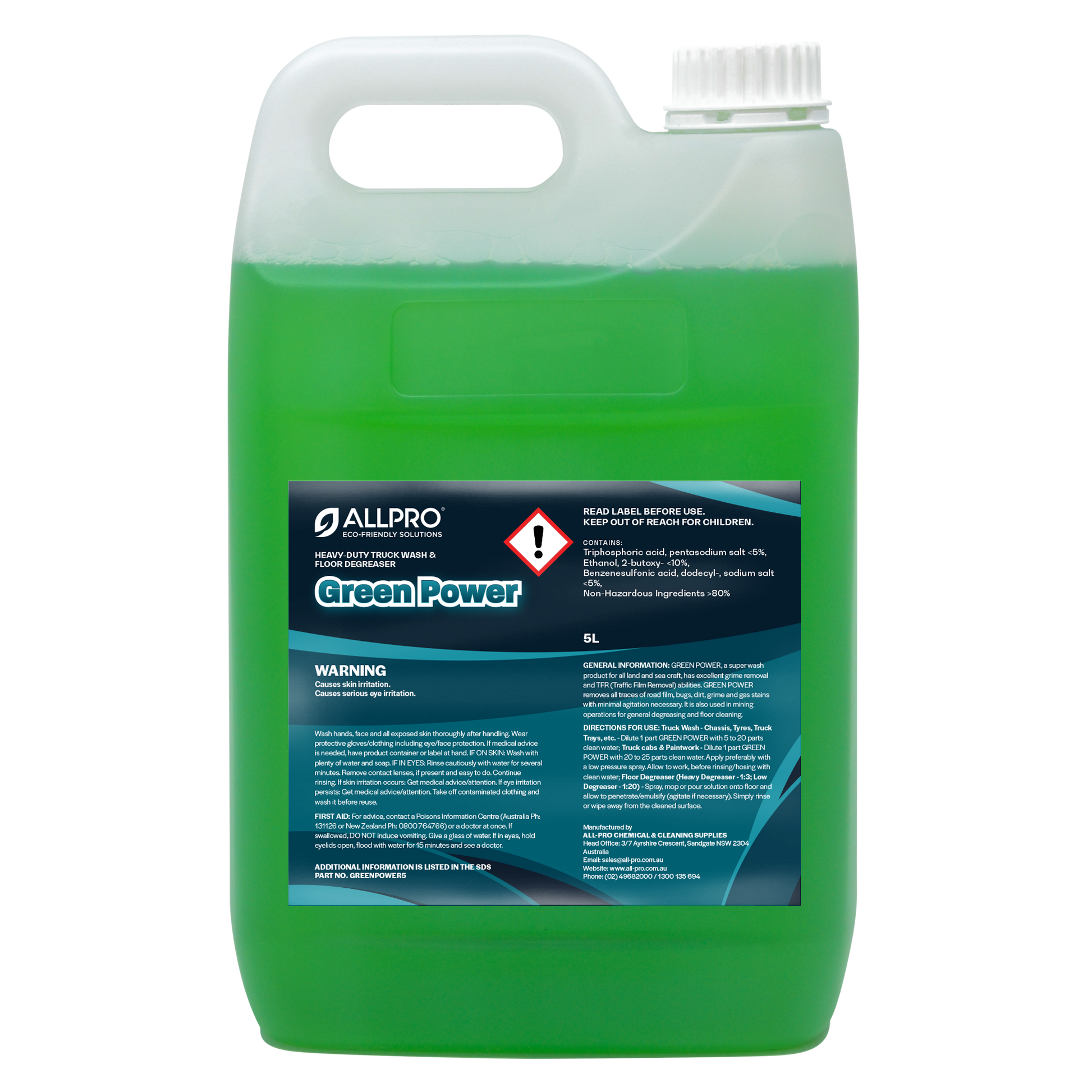 GREEN POWER, a super wash product for all land and sea craft, has excellent grime removal and TFR (Traffic Film Removal) abilities. GREEN POWER removes all traces of road film, bugs, dirt, grime and gas stains with minimal agitation necessary. It is also used in mining operations for general degreasing and floor cleaning.